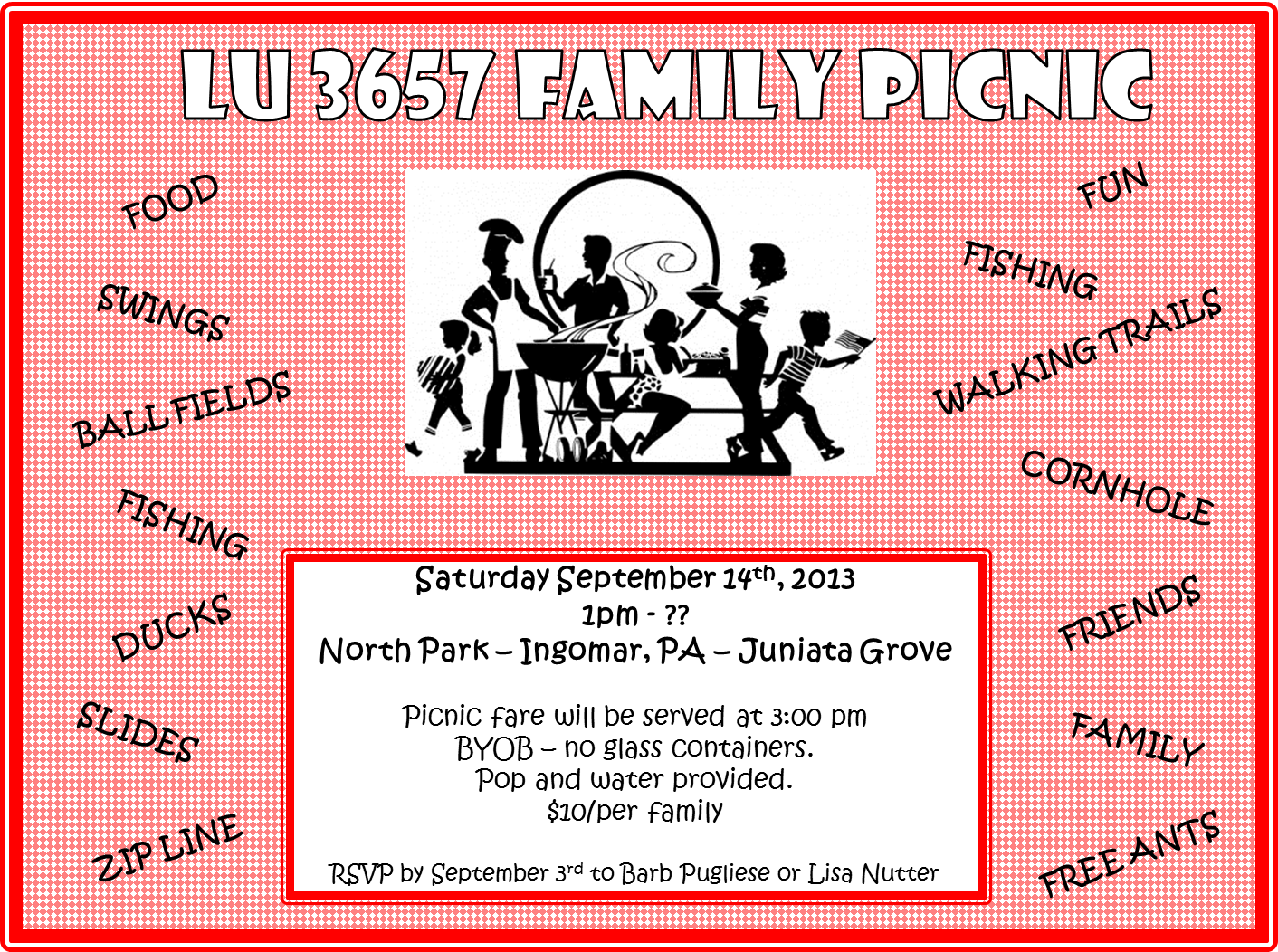 Please send your RSVP to Barb Pugliese or Lisa Nutter by September 4th. Be sure to include the number of adults and kids (and the kids ages) in your party. Any questions about the picnic can be directed to Barb or Lisa