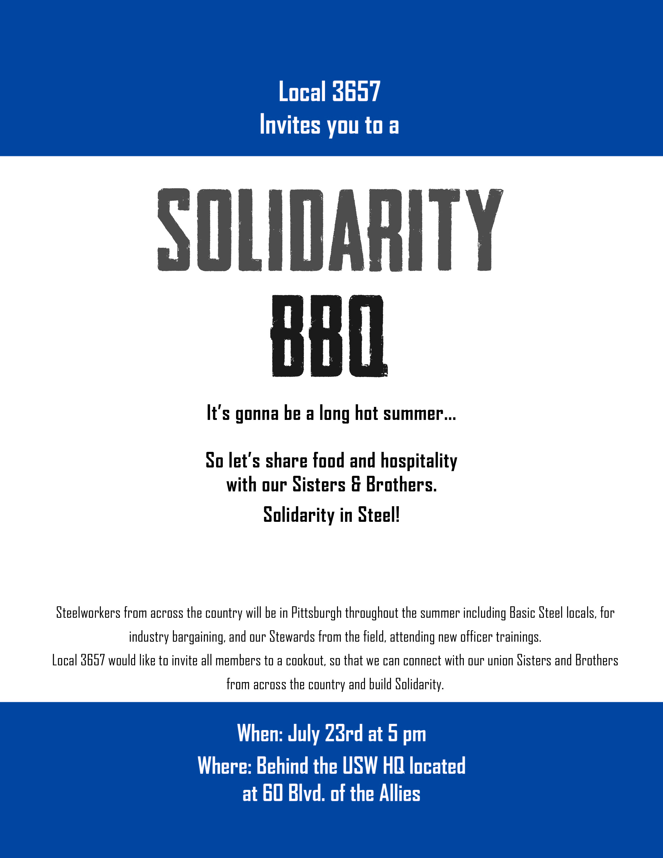 LU 3657 Solidarity BBQ Image Posted on July 16, 2015 by lnutter Share this: Click to share on X (Opens in new window) X Click to email a link to a friend (Opens in new window) Email Click to share on Facebook (Opens in new window) Facebook Like Loading... Related